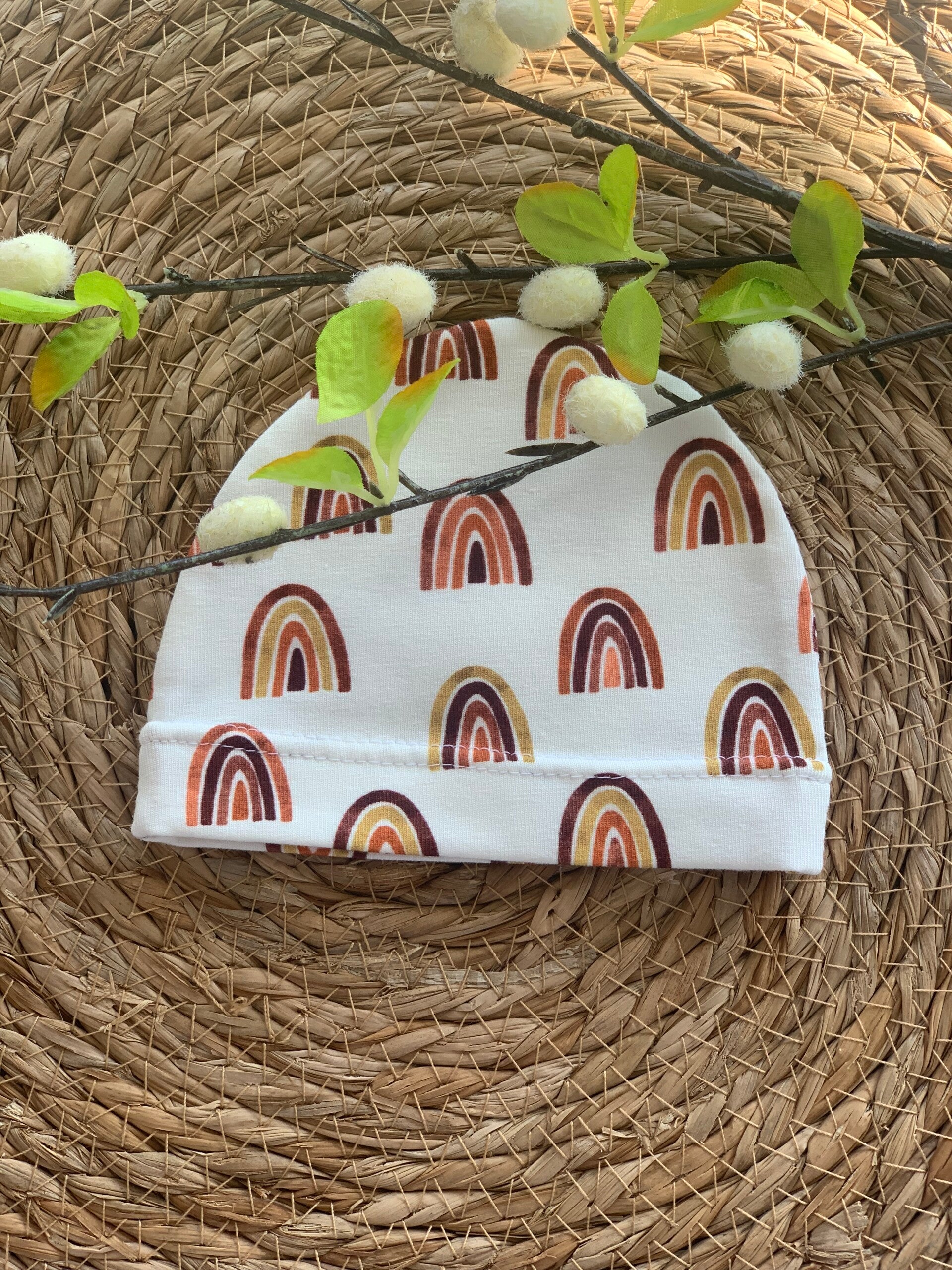 Dit lieve prematuur mutsje straalt warmte en zachtheid uit. De offwhite basis met schattige regenboogjes in warme rood- en bruintinten zorgt voor een rustgevende, stijlvolle look. Gemaakt van zacht, rekbaar katoen tricot, voelt het mutsje heerlijk comfortabel aan op de tere huid van je baby. Het enkel laags ontwerp maakt het licht en ademend — perfect voor in de couveuse of knuffelmomentjes.