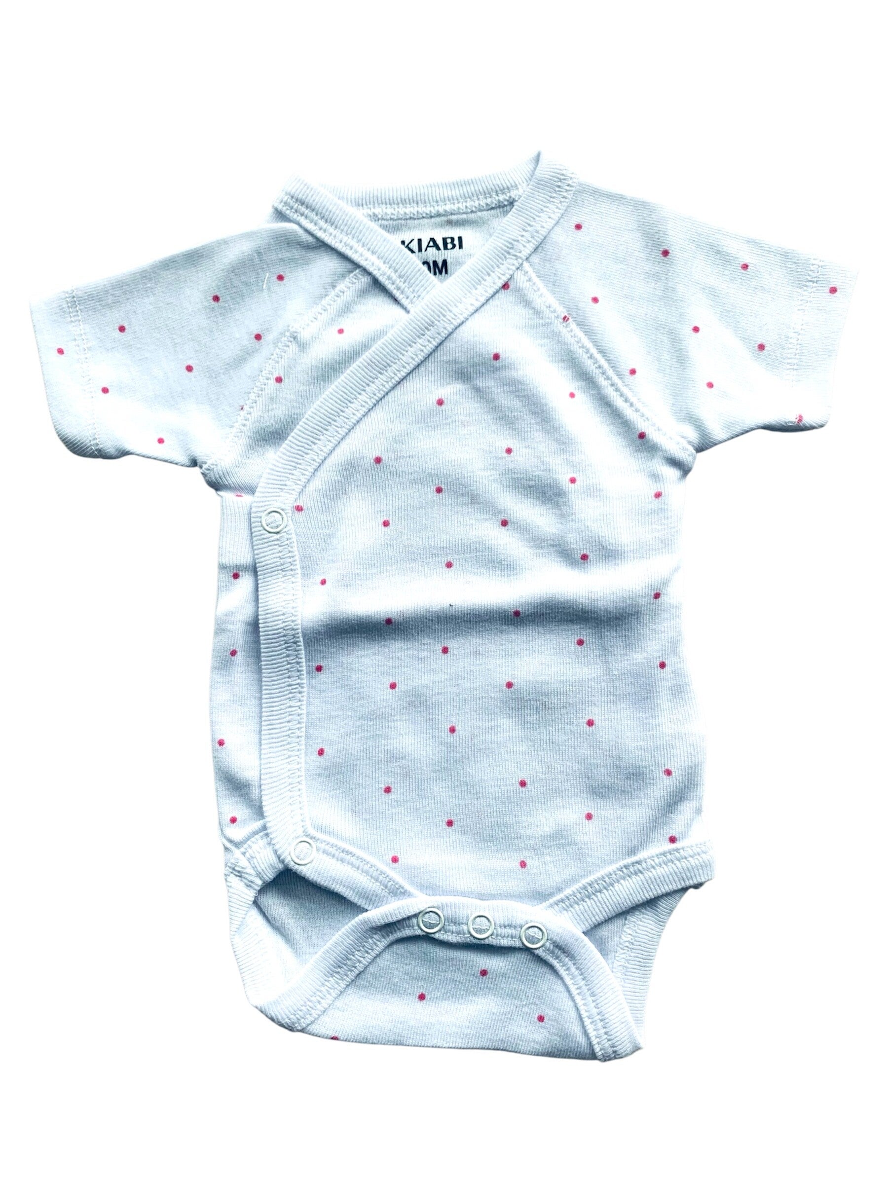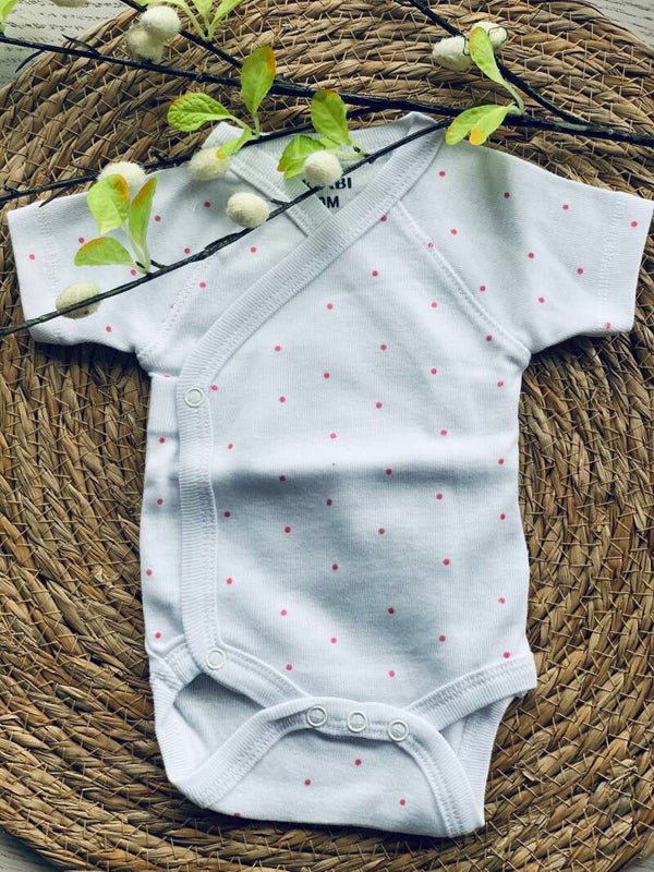 Deze zachte romper van het merk Kiabi is ideaal voor pasgeboren baby’s (maat 0M (48/50). Gemaakt van 100% katoen voelt de romper heerlijk comfortabel en ademend aan op de gevoelige babyhuid. Het klassieke witte design met schattige roze stippen geeft een frisse en speelse uitstraling.