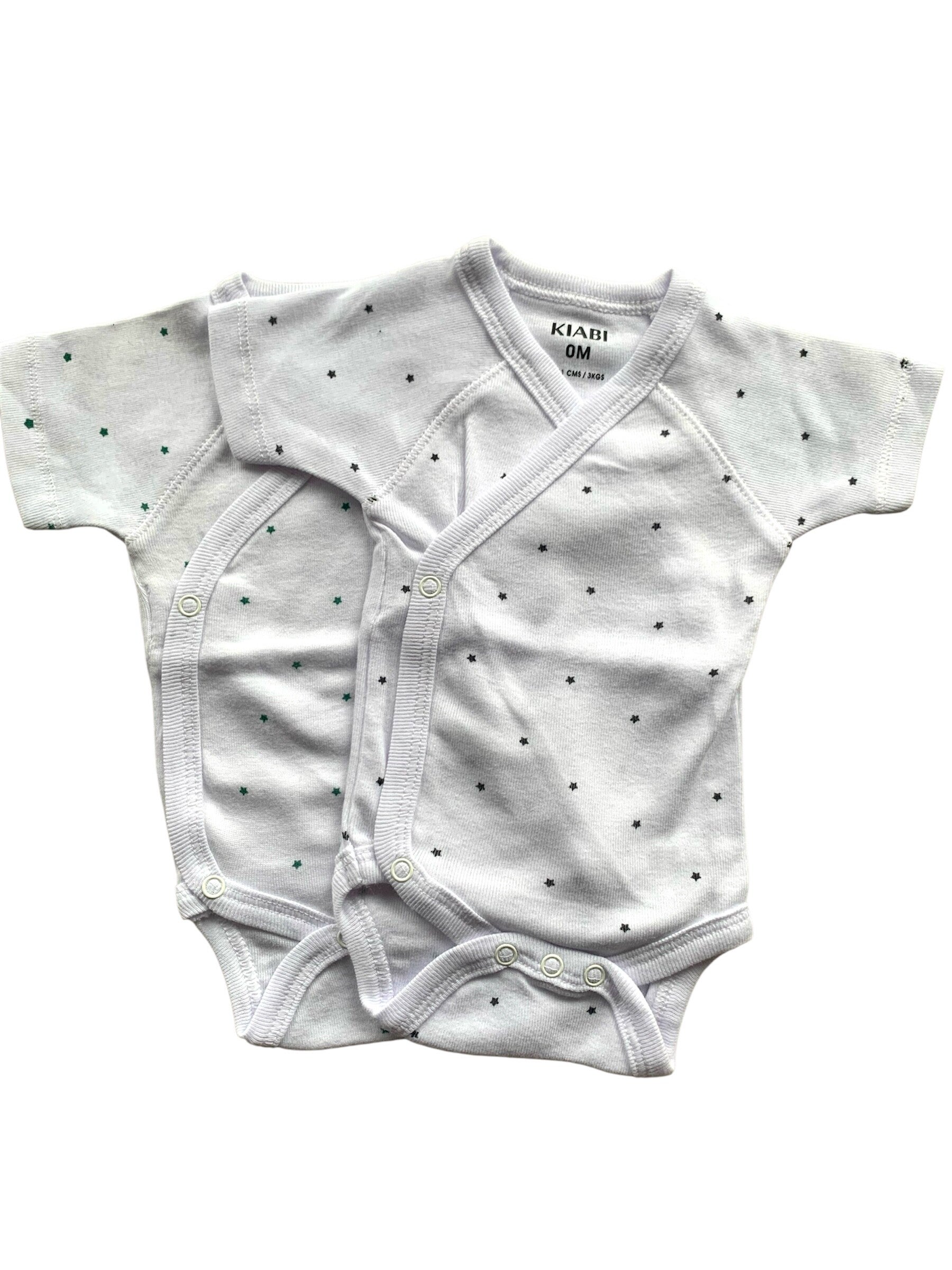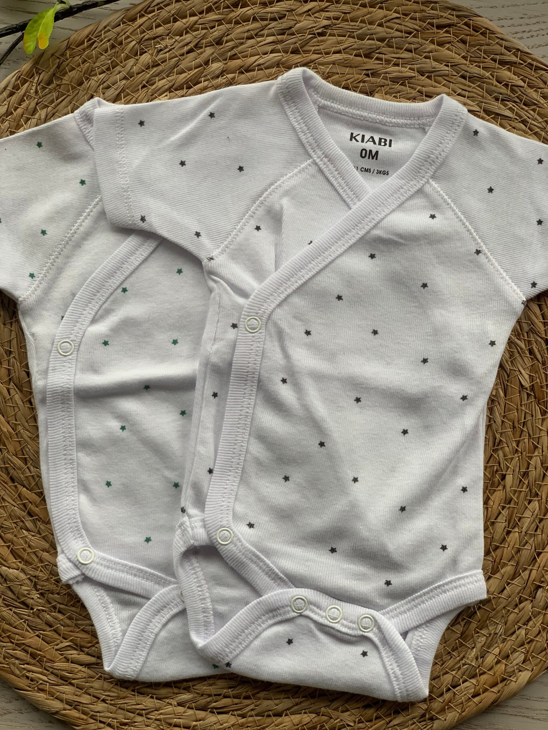 Deze zachte overslag rompertjes van het merk Kiabi zijn perfect voor pasgeboren baby’s (maat 0M / 48/50). Gemaakt van 100% katoen voelen ze heerlijk comfortabel en ademend aan, ideaal voor de gevoelige babyhuid.
