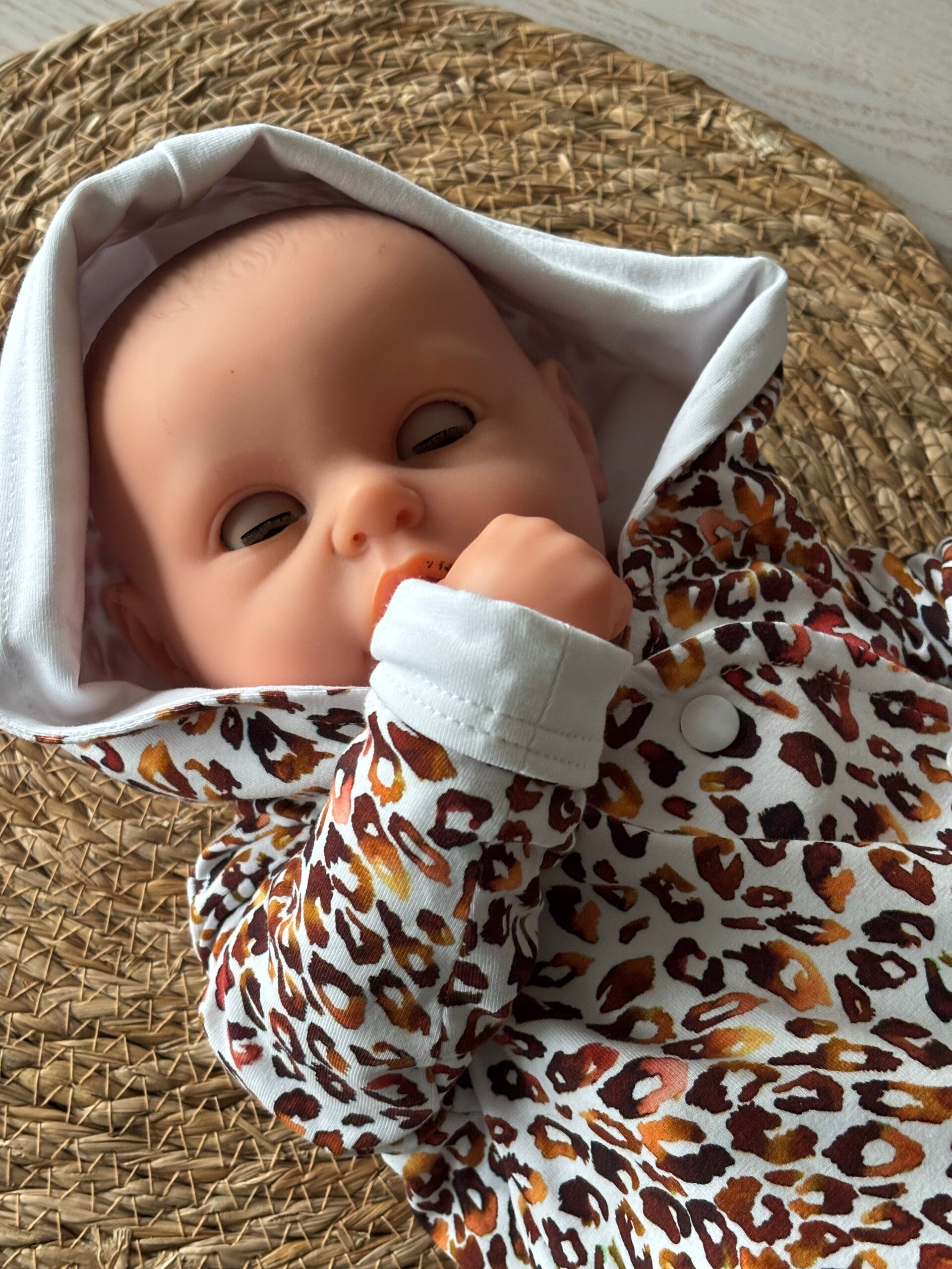 De buitenzijde met stijlvolle panterprint geeft het jasje een hippe uitstraling, terwijl de binnenzijde van witte, ademende katoen tricot zorgt voor een heerlijk zacht gevoel op de huid. De capuchon biedt extra warmte en geborgenheid.