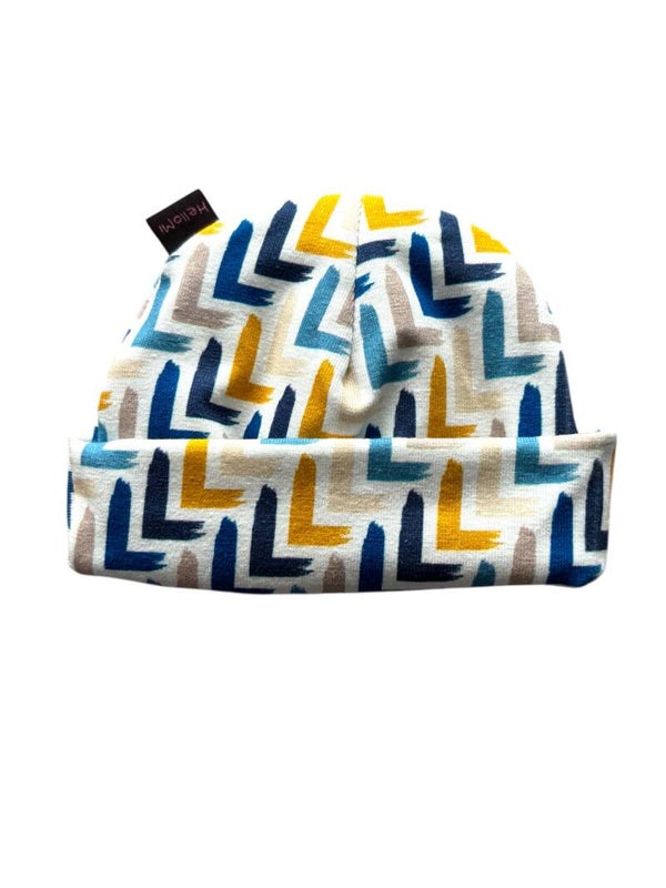 De couveuse deken is gemaakt van donkerblauw wafel katoen, dat bekend staat om zijn zachte structuur en ademend vermogen. De andere zijde is uitgevoerd in een bijpassende blauw–oker tricot print, wat zorgt voor een warme en eigentijdse uitstraling. Het prematuur mutsje is gemaakt van dezelfde comfortabele tricot stof, zodat het geheel prachtig matcht.