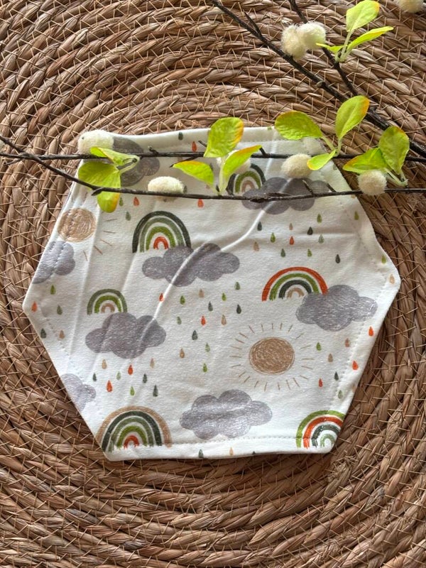 Het geurdoekje is gemaakt van zacht en ademend katoen, geschikt voor de gevoelige huid van (premature) baby’s. De witte basis met grijze wolkjes en groene regenboogjes zorgt voor een rustige, neutrale en troostende uitstraling.