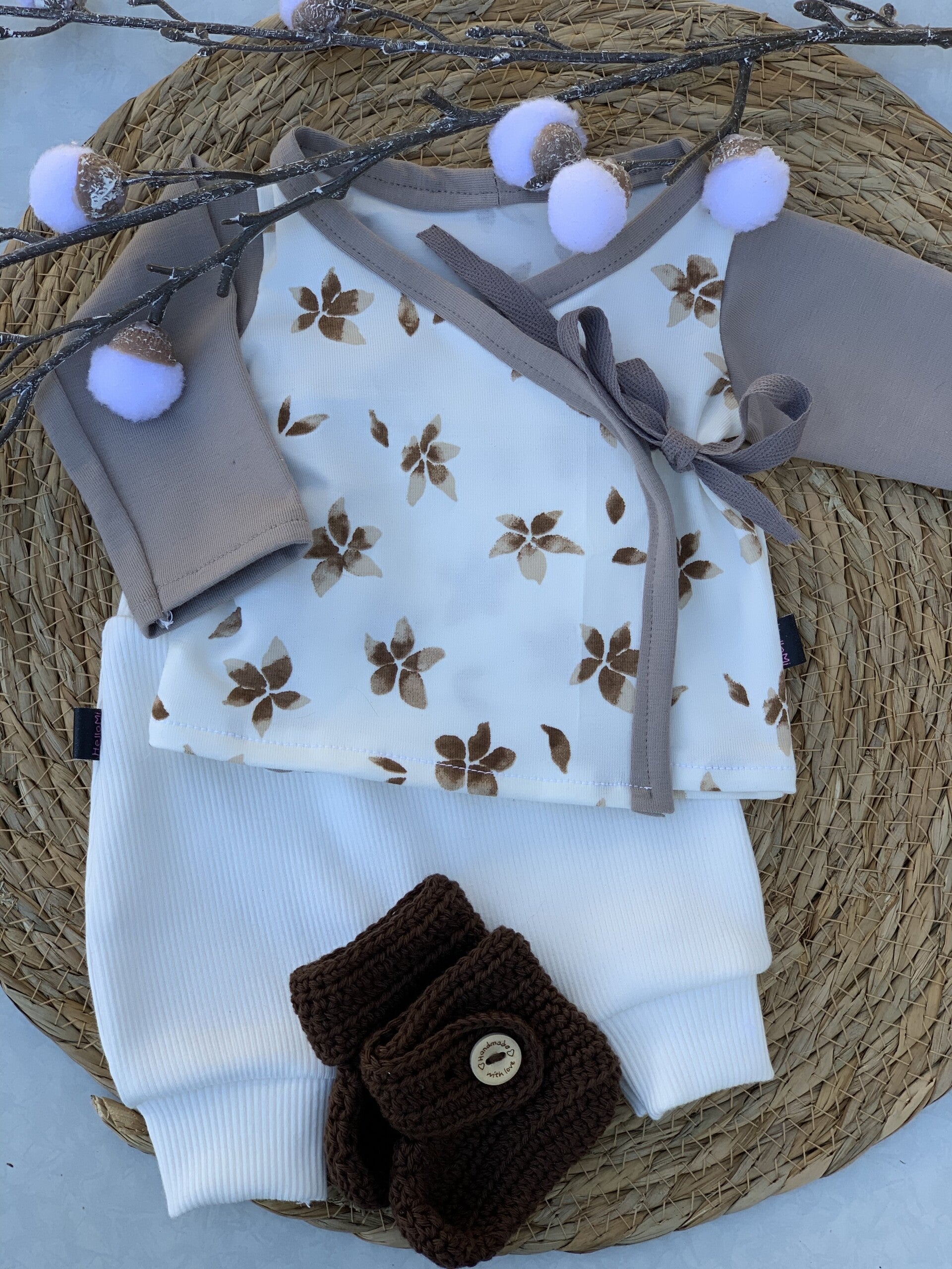 - kleur: off white met print van bruine bloem (blaadjes) en licht bruine mouwen.