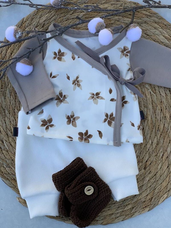 Dit overslag shirtje heeft een print van bruine bloemen (blaadjes)